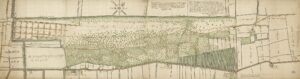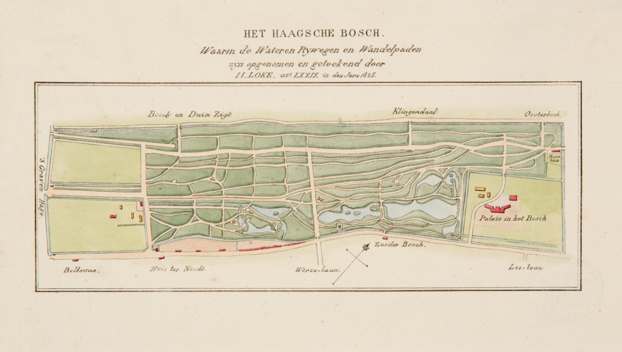 I.I. Loke. Plattegrond van Haagsche Bosch, 1825, met wegen en paden en de grote waterpartij
