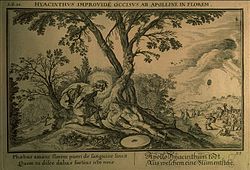 Hyacint uit de jongeling Hyacinthus geliefd door Apollo. Nadat hij per ongeluk door een discus wordt gedood, verandert Apollo zijn bloed in de hyacintbloem.